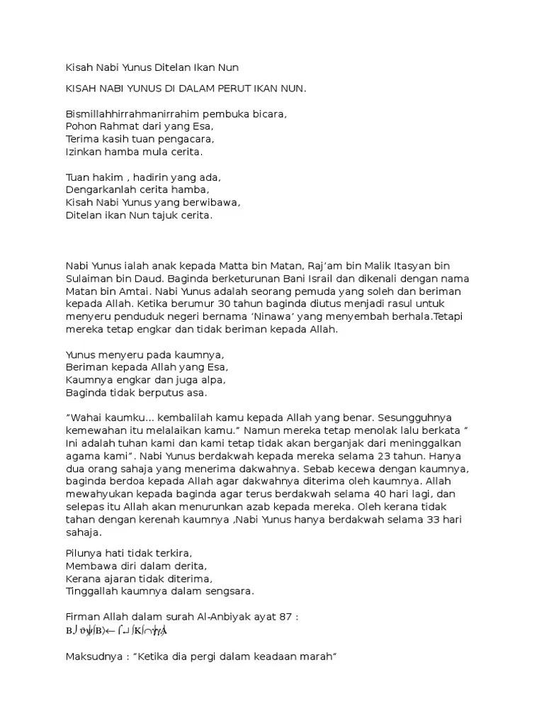 Sehingga beliau berdoa dan memohon ampun teks bercerita kisah nabi. Kisah nabi yunus dimulai ketika pergi ke tepi laut dan menaiki kapal.